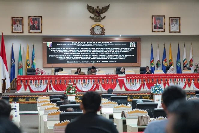 Lampungcawa, Bandarlampung – Wakil Gubernur Lampung Jihan Nurlela menghadiri Rapat Paripurna Dewan Perwakilan Daerah (DPRD) Provinsi Lampung Pembicaraan Tingkat II dalam rangka Laporan Panitia Khusus (Pansus) Laporan Hasil Pemeriksaan (LHP) Badan Pemeriksa Keuangan (BPK) atas Laporan Keuangan Pemerintah Daerah Provinsi Lampung Tahun 2024 di Ruang Sidang DPRD Provinsi Lampung, Selasa (17/6/2025).