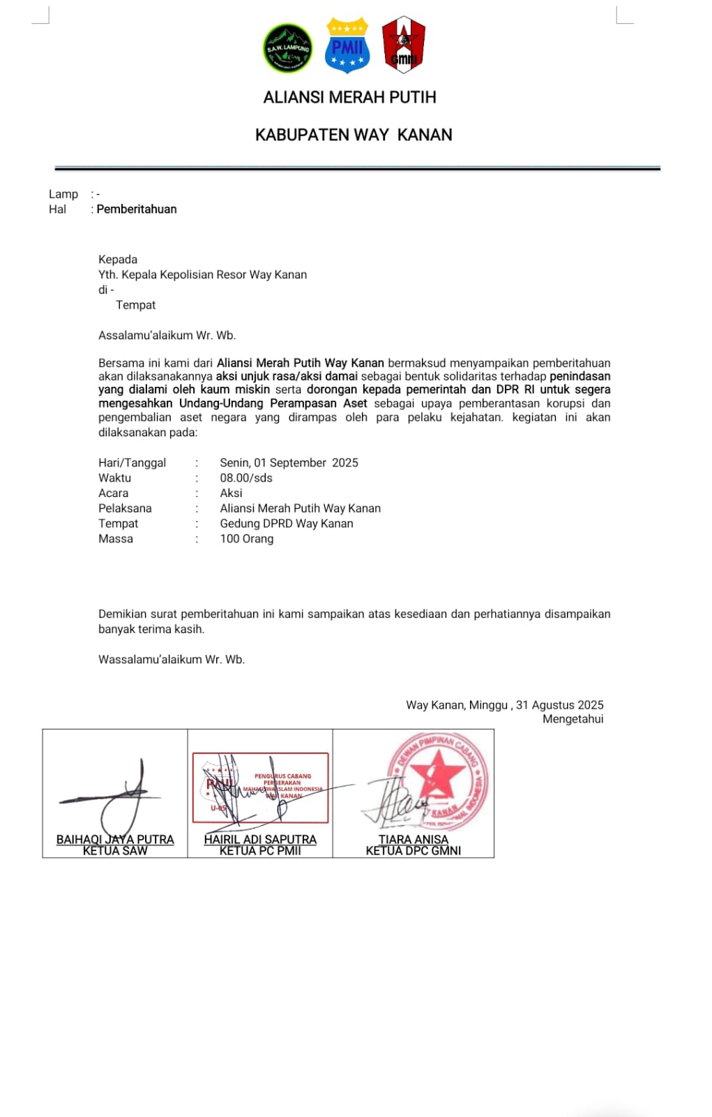 Lampungcawa, Way Kanan – Aliansi Merah Putih melalui Sekretaris Korlap Aksi, Doni Saputra, S.H., mengeluarkan klarifikasi resmi terkait beredarnya surat pemberitahuan aksi di publik yang dinilai belum melalui tahapan finalisasi resmi.