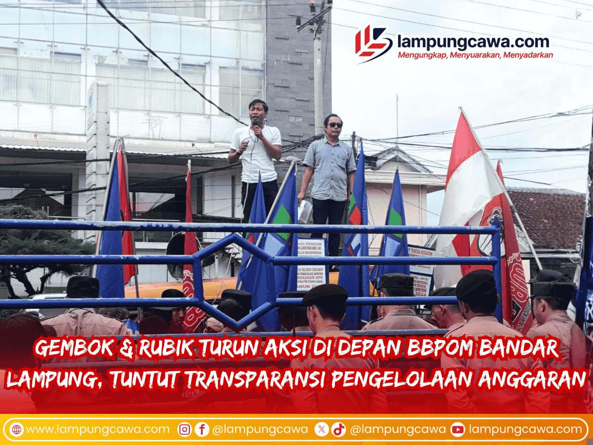 Lampungcawa, Bandar Lampung – Dua lembaga swadaya masyarakat (LSM), GEMBOK (Gerakan Masyarakat Bongkar Korupsi) dan RUBIK (Restorasi Untuk Kebijakan), melakukan aksi demonstrasi di kantor Balai Besar Pengawas Obat dan Makanan (BBPOM) Bandar Lampung pada Senin (14/10/2025). Aksi tersebut menuntut transparansi pengelolaan anggaran APBN Tahun 2024 yang diduga sarat dengan indikasi penyelewengan.