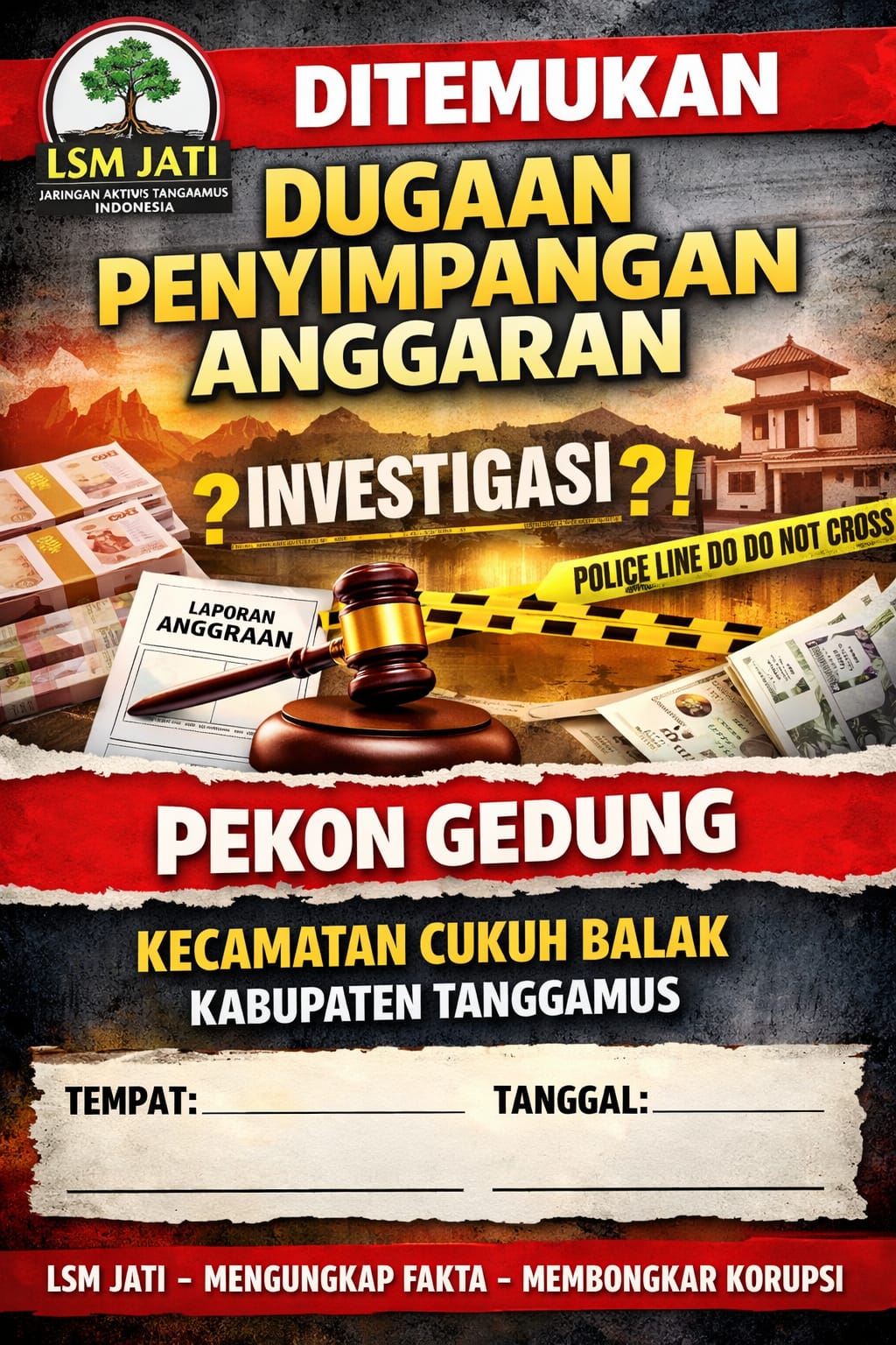 TANGGAMUS, Lampung – Lembaga Swadaya Masyarakat Jaringan Transparansi Kebijakan Indonesia (JATI) Provinsi Lampung menuntut transparansi dan kejelasan atas realisasi Anggaran Pendapatan dan Belanja Desa (APBDes) Pekon Gedung, Kecamatan Cukuh Balak, Kabupaten Tanggamus, tahun 2024. LSM yang diketuai oleh Ahmad Padlan, S.H. ini menemukan dugaan serius indikasi korupsi dalam beberapa kegiatan, berupa kekurangan volume pekerjaan fisik dan praktek mark up harga.