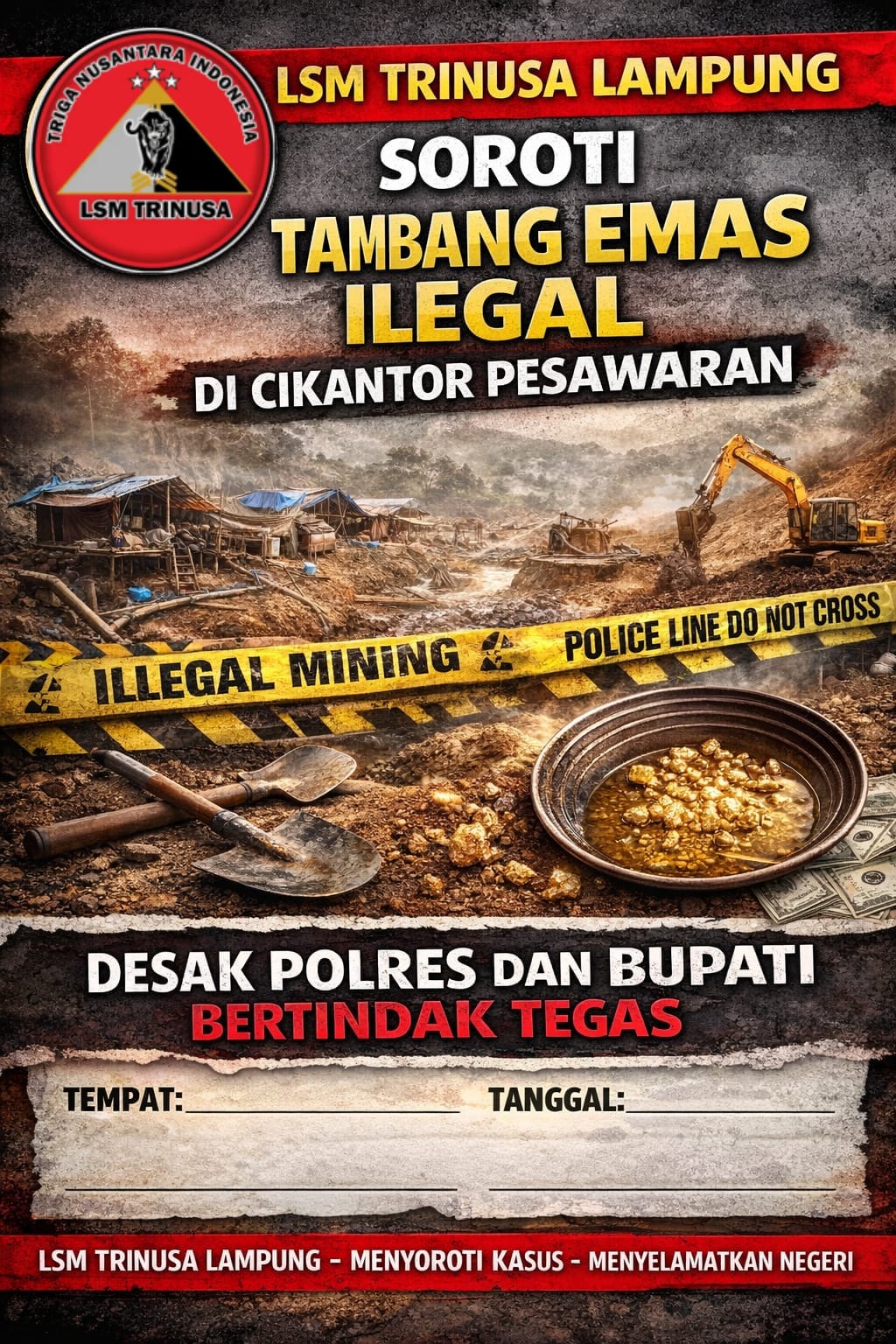 PESAWARAN – Lembaga Swadaya Masyarakat (LSM) TRINUSA Dewan Pimpinan Daerah (DPD) Provinsi Lampung mendesak tegas Aparat Penegak Hukum (APH), khususnya Polres Kabupaten Pesawaran melalui Polsek Kedondong, untuk segera membongkar dan menindak praktik penambangan emas ilegal yang diduga merusak lingkungan di wilayah Kecamatan Kedondong.